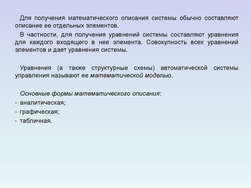 Для получения математического описания системы обычно составляютописание ее отдельных элементов.