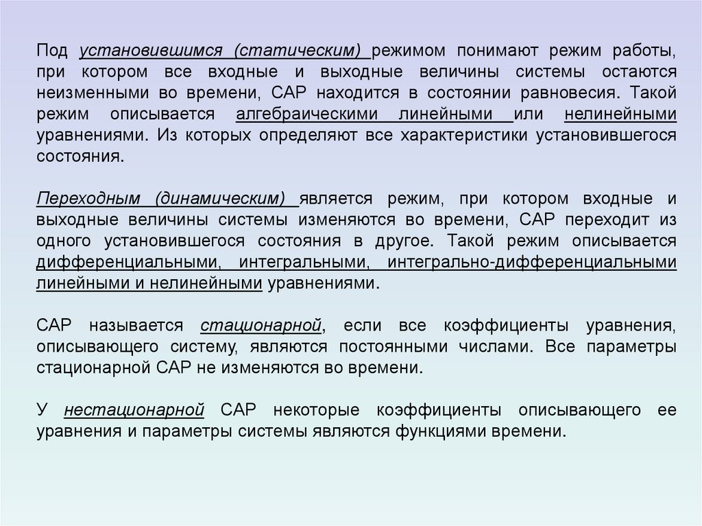 Под установившимся (статическим) режимом понимают режим работы,при котором все входные и выходные величины системы остаются