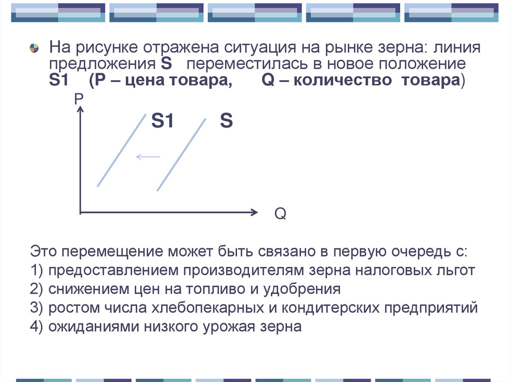 На рисунке отражена ситуация на рынке зерна: линияпредложения S переместилась в новое положение