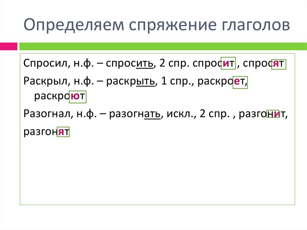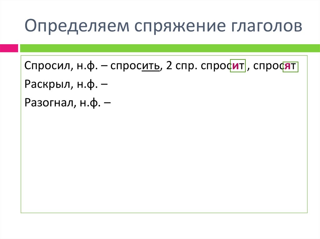 Определяем спряжение глаголовСпросил, н.ф. – спросить, 2 спр. спросит , спросят