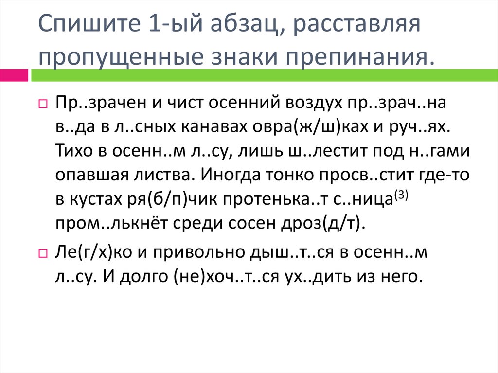 Спишите 1-ый абзац, расставляяпропущенные знаки препинания.