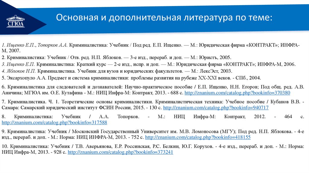 1. Ищенко Е.П., Топорков А.А. Криминалистика: Учебник / Под ред. Е.П. Ищенко. — М.: Юридическая фирма «КОНТРАКТ»; ИНФРАМ, 2007.
