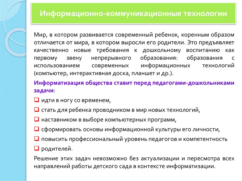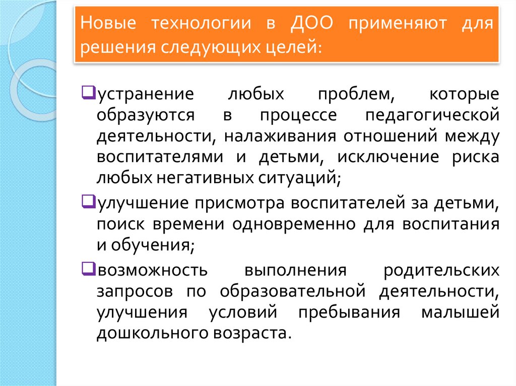 Новые технологии в ДОО применяют длярешения следующих целей:
