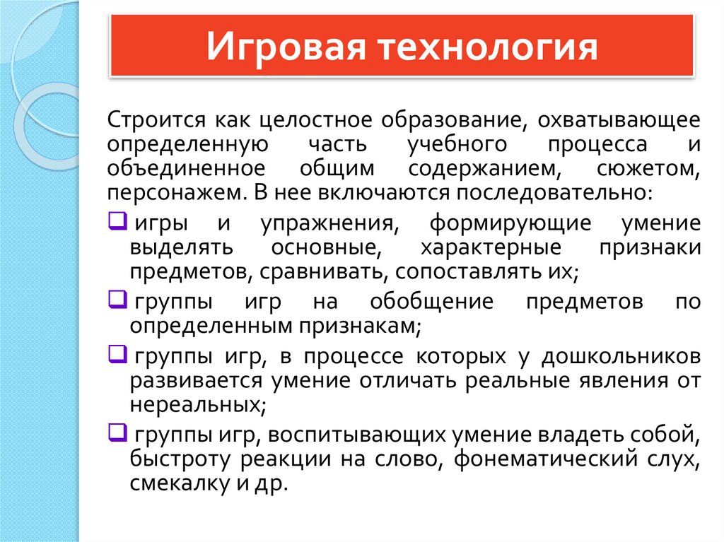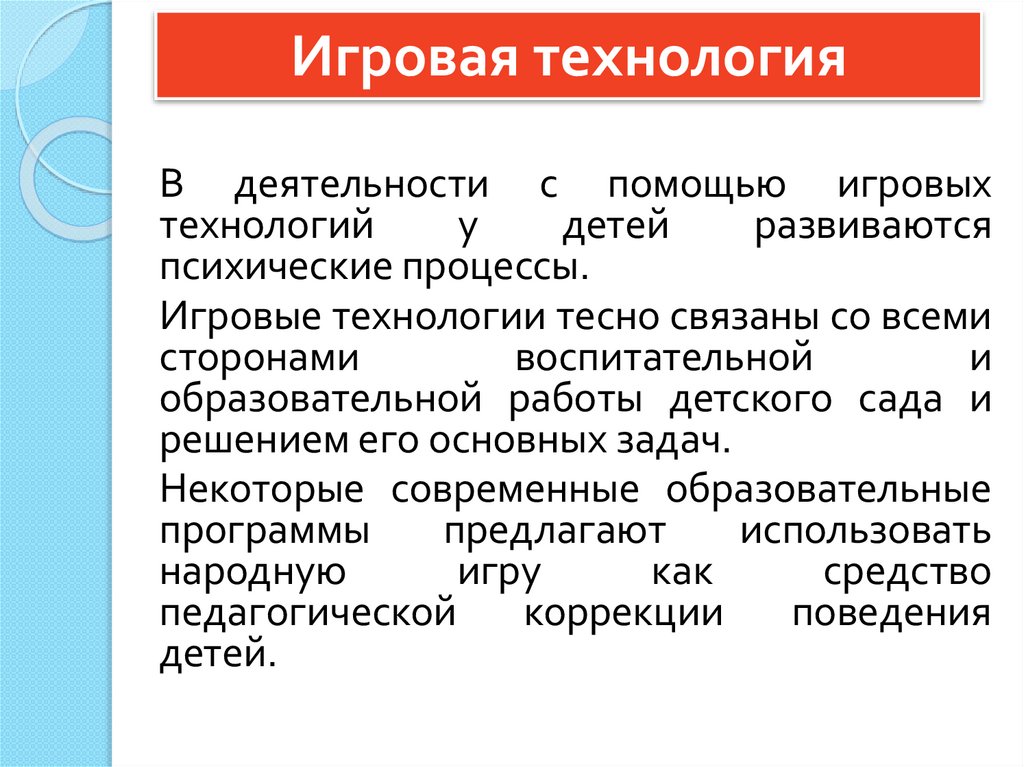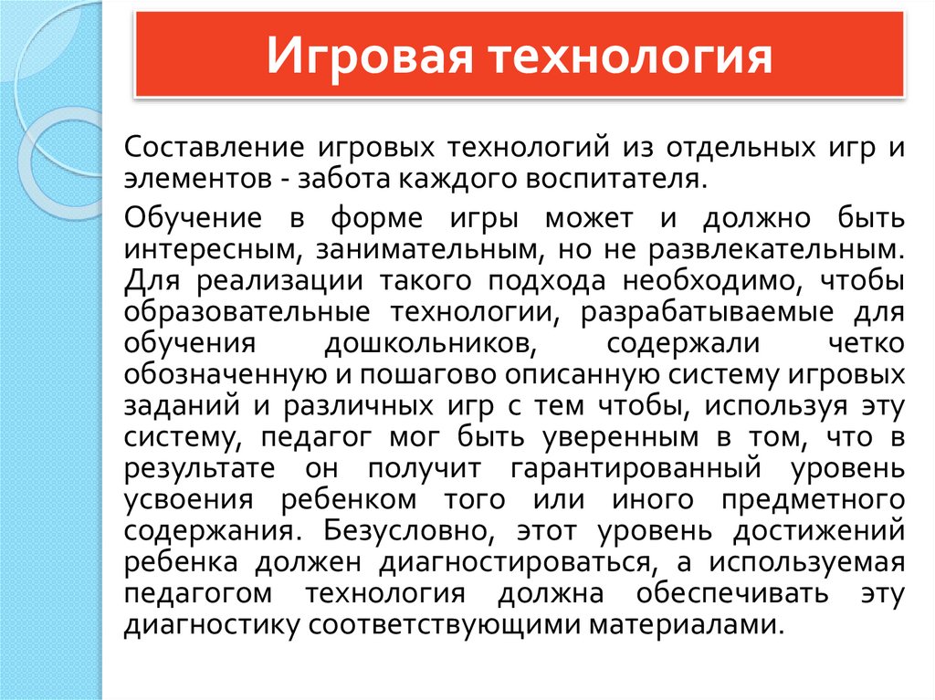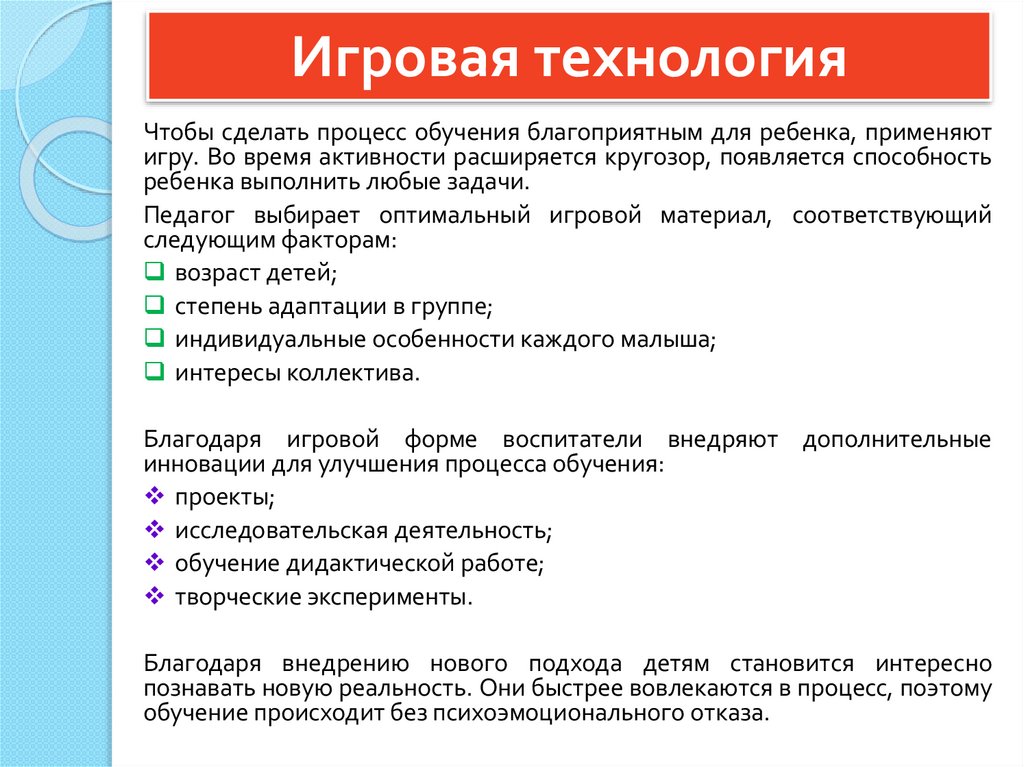 Игровая технологияЧтобы сделать процесс обучения благоприятным для ребенка, применяют
