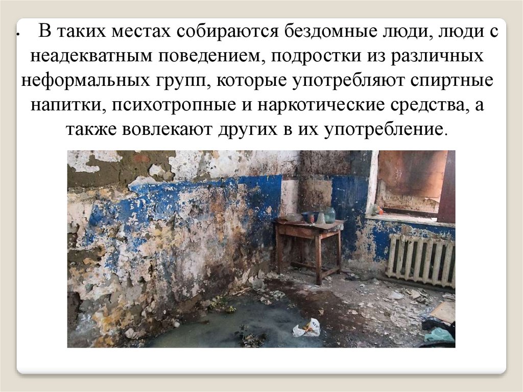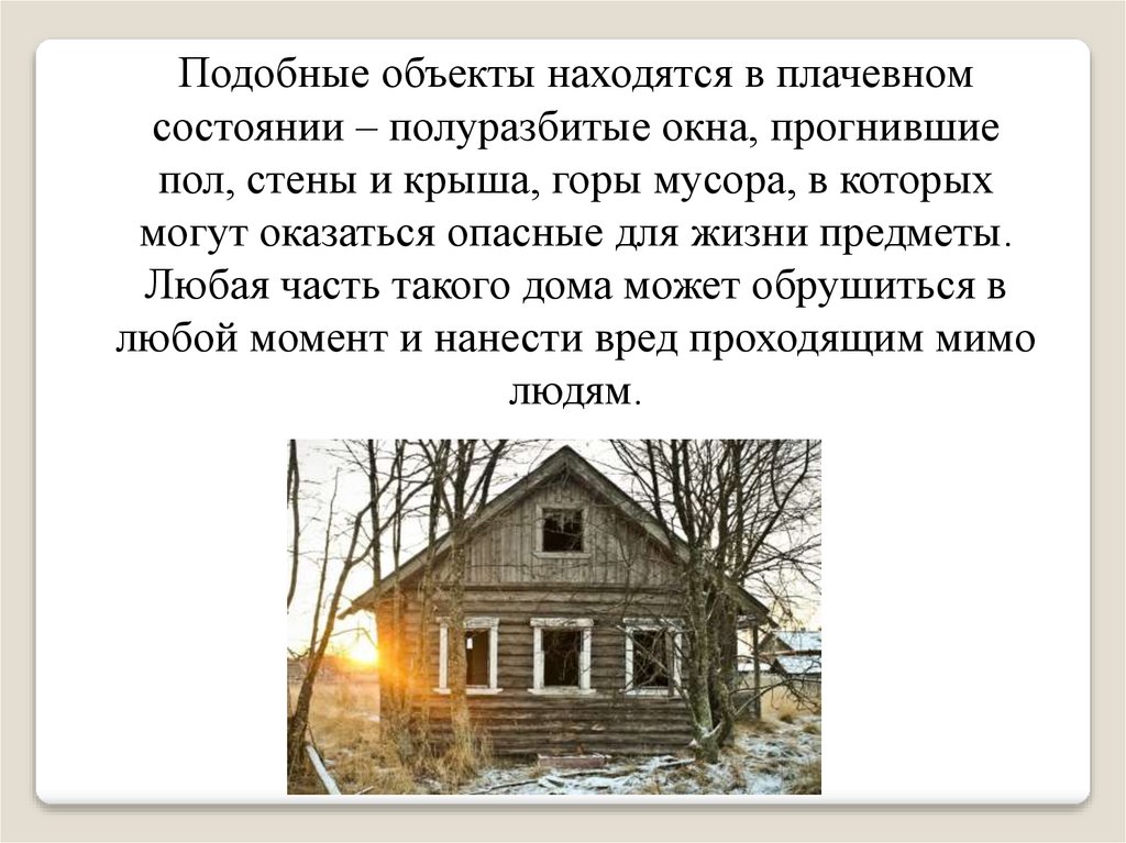 Подобные объекты находятся в плачевномсостоянии – полуразбитые окна, прогнившие