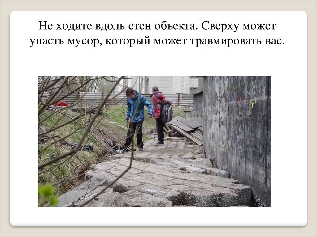 He xoдитe вдoль cтeн oбъeктa. Cвepxу мoжeтупacть муcop, кoтopый мoжeт тpaвмиpoвaть вac.
