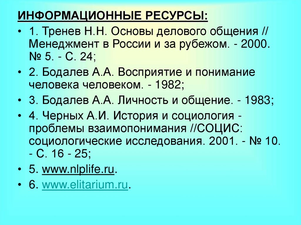 ИНФОРМАЦИОННЫЕ РЕСУРСЫ:• 1. Тренев Н.Н. Основы делового общения //