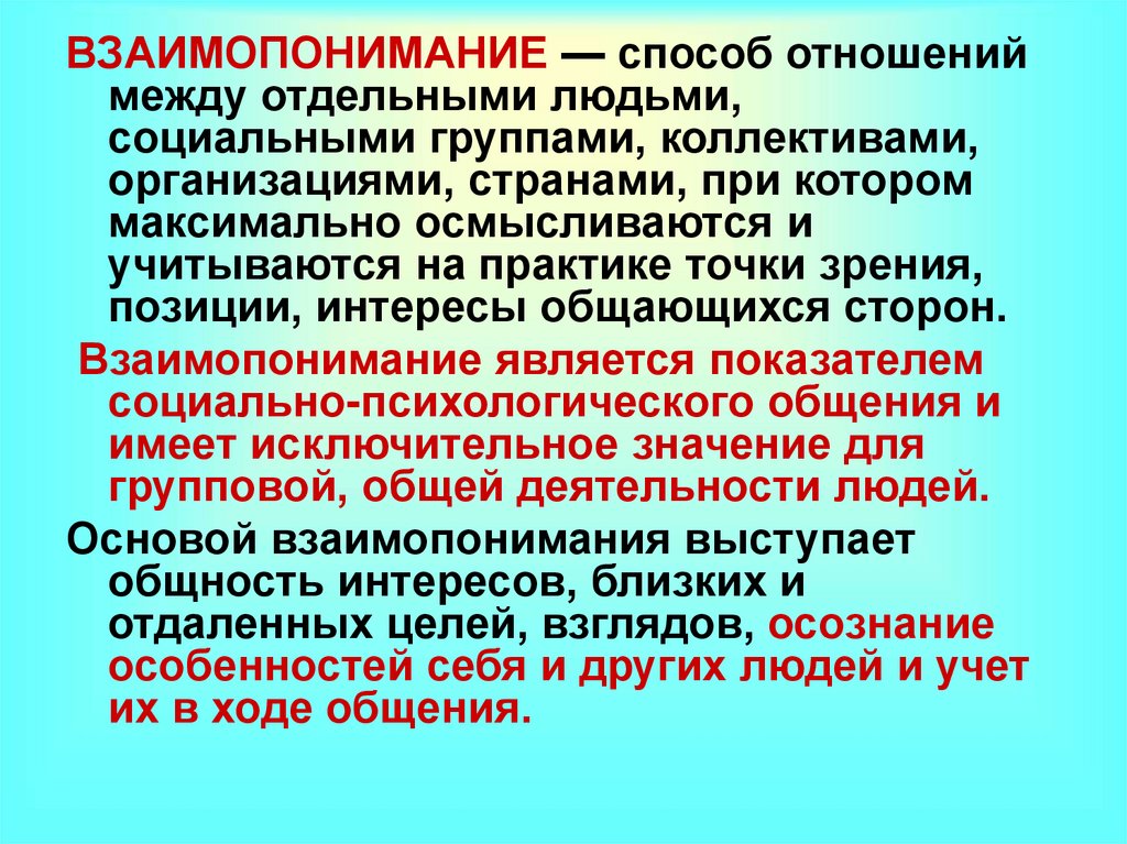 ВЗАИМОПОНИМАНИЕ — способ отношениймежду отдельными людьми,