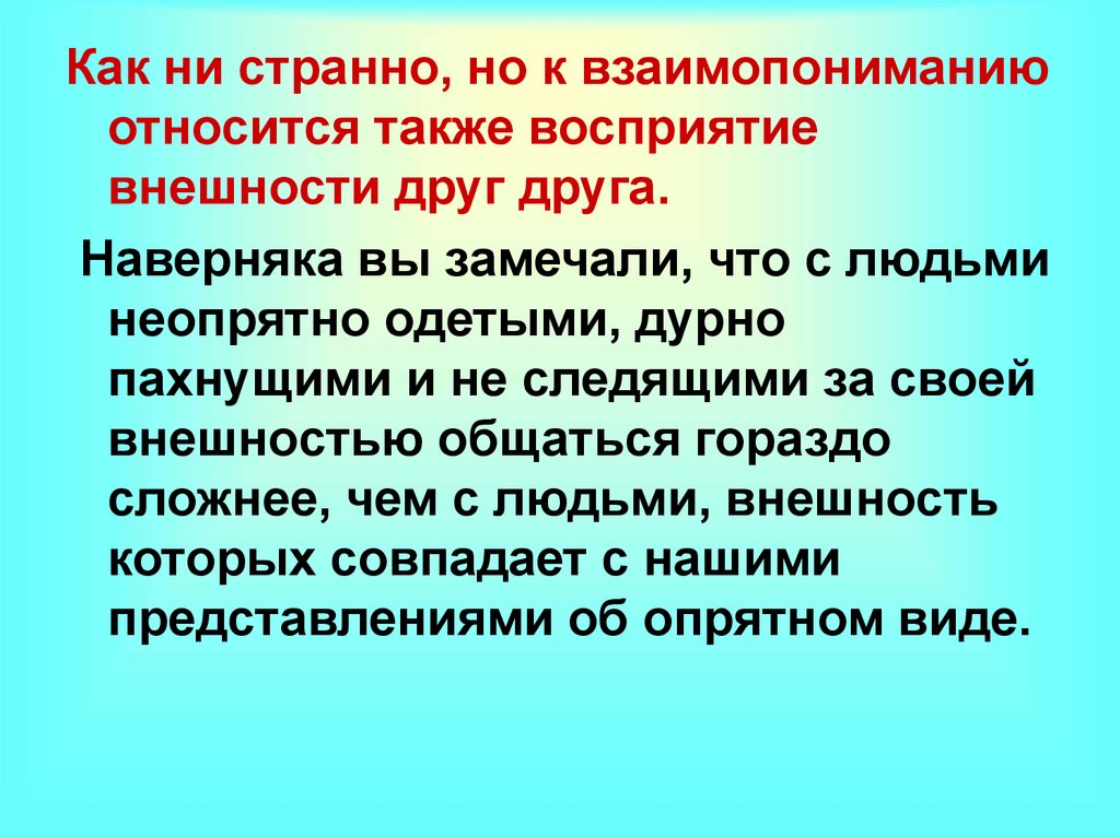 Как ни странно, но к взаимопониманиюотносится также восприятие
