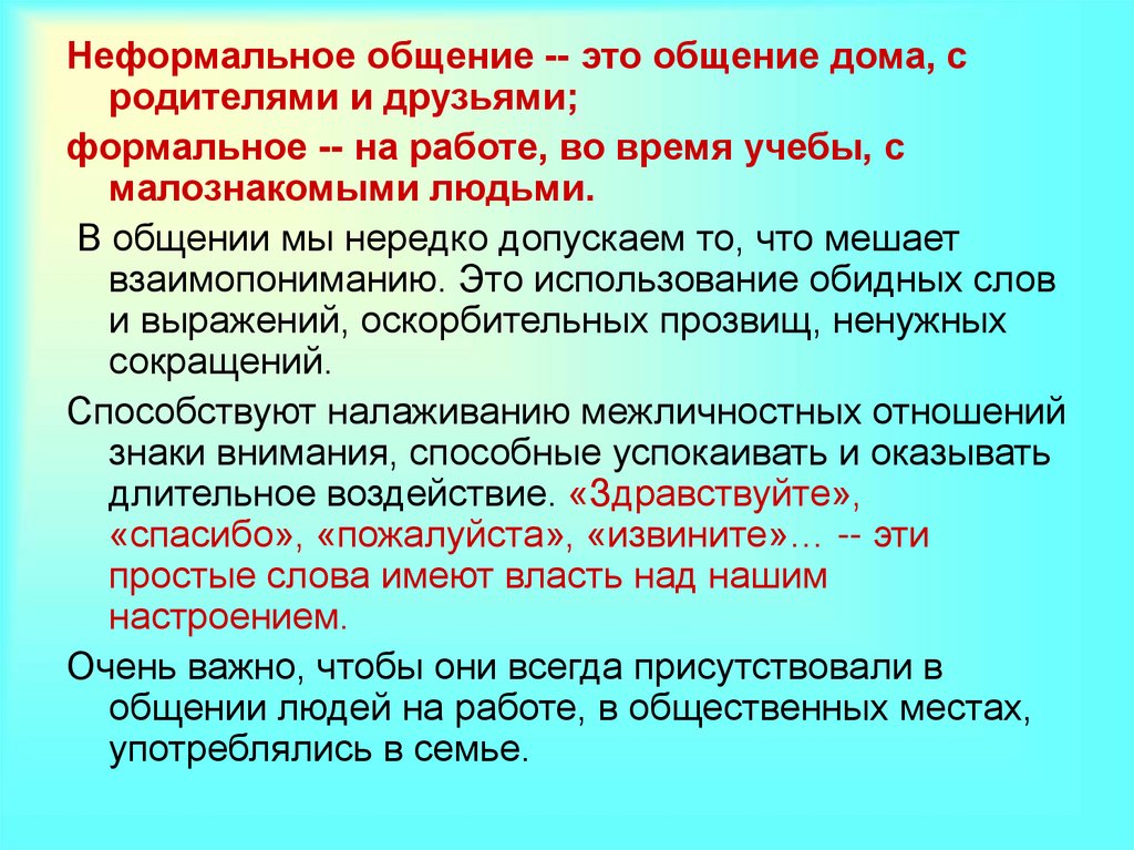 Неформальное общение -- это общение дома, сродителями и друзьями;