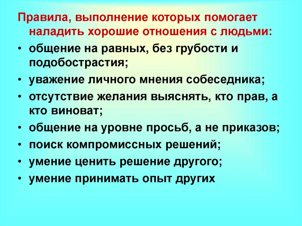 Правила, выполнение которых помогаетналадить хорошие отношения с людьми:
