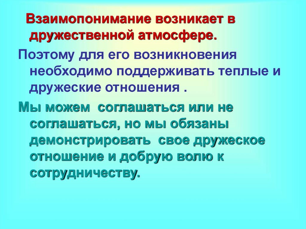 Взаимопонимание возникает вдружественной атмосфере.