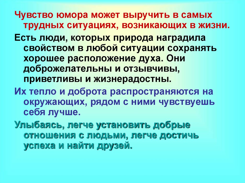 Чувство юмора может выручить в самыхтрудных ситуациях, возникающих в жизни.