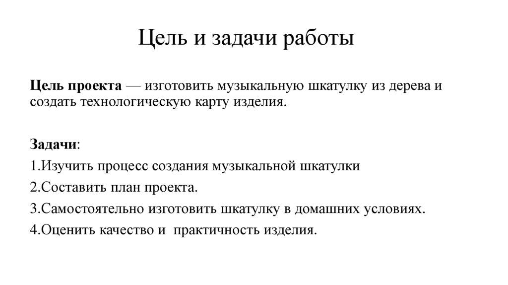 Цель и задачи работыЦель проекта — изготовить музыкальную шкатулку из дерева и