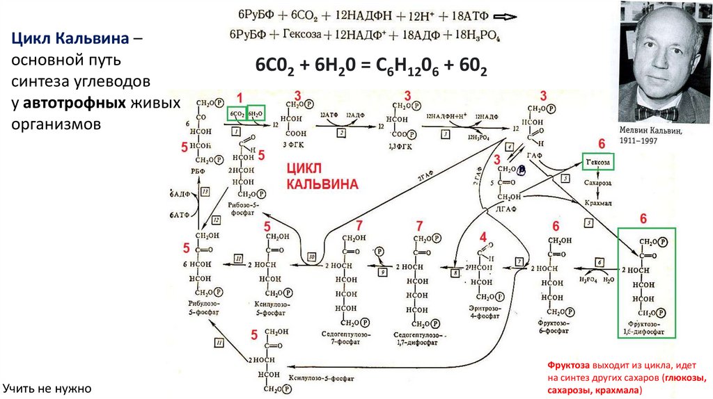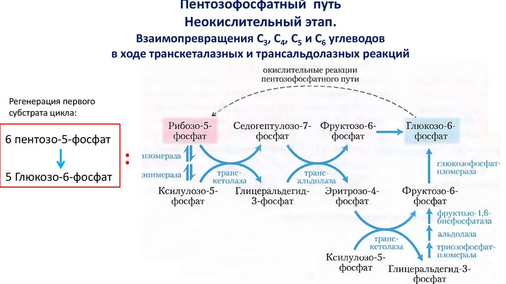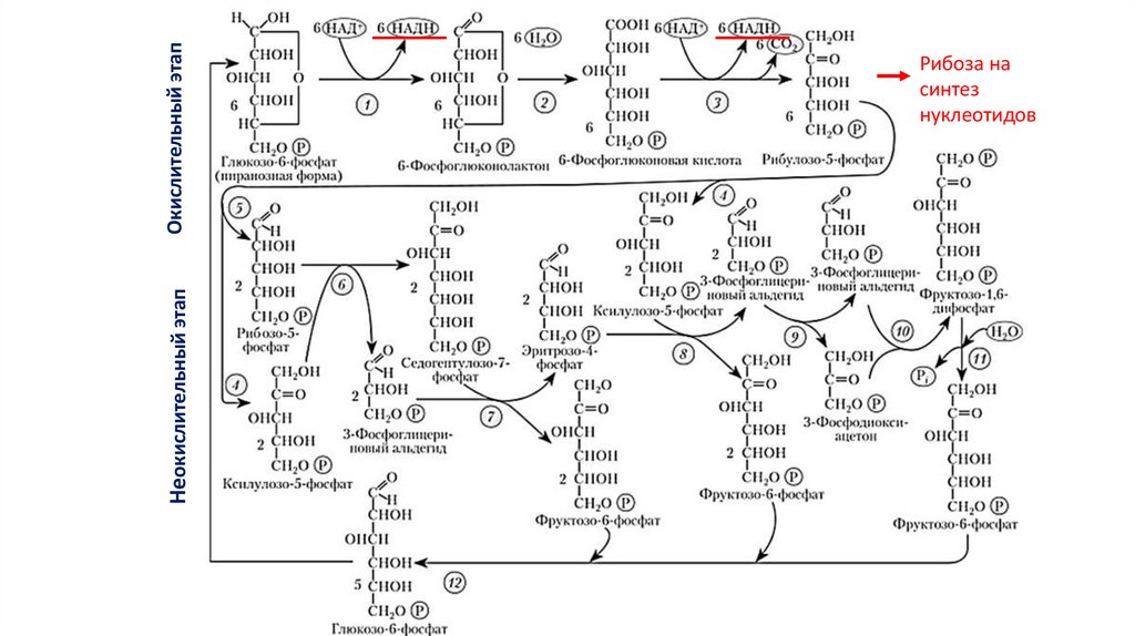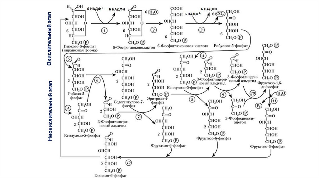 6 Глюкозо-6-фосфат + 12 НАДФ +7 Н2О → 5 Глюкозо-6-фосфат + 6СО2 + 1Фн +12 НАДФН2