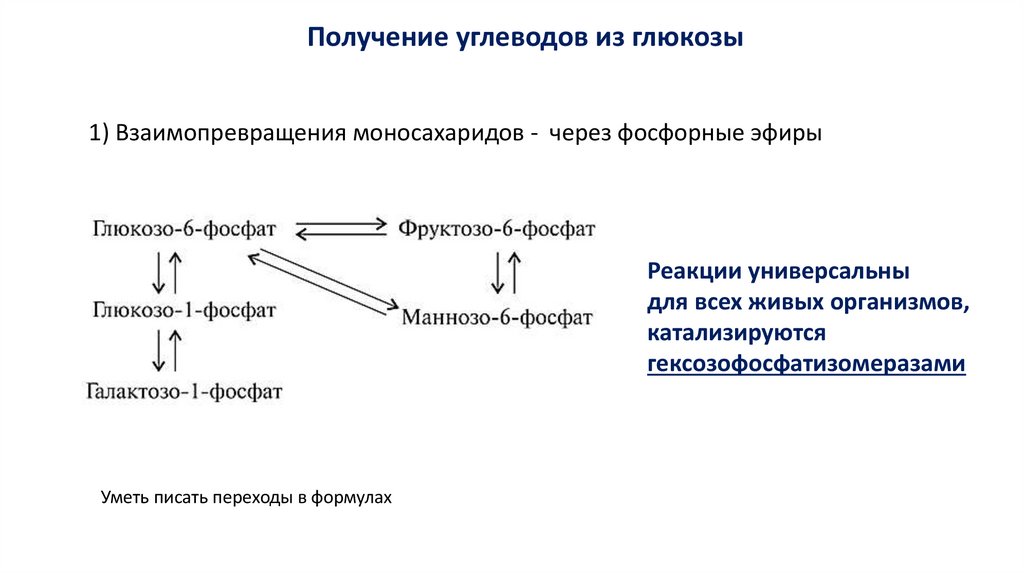 Получение углеводов из глюкозы1) Взаимопревращения моносахаридов - через фосфорные эфиры