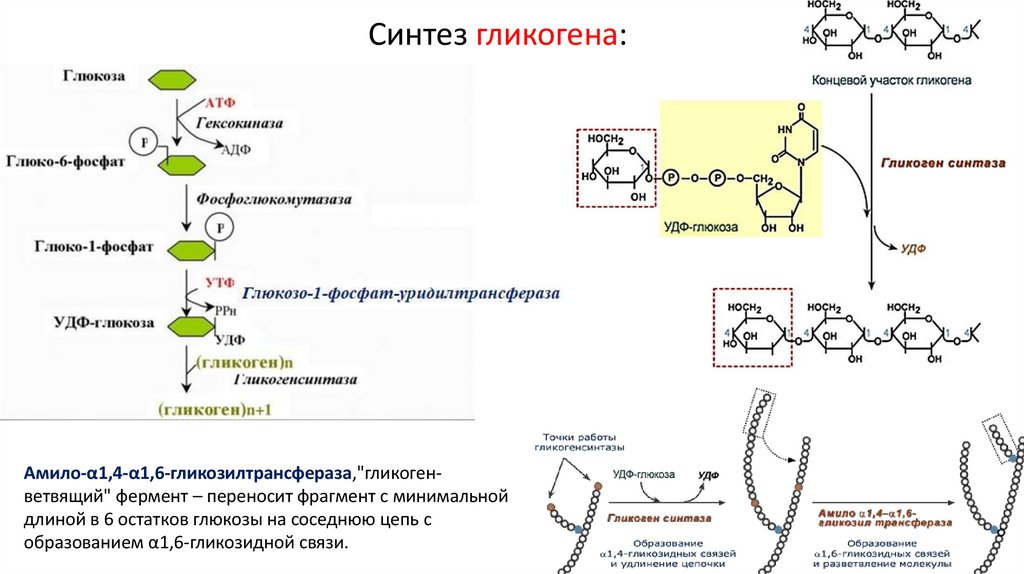 Синтез гликогена:Амило-α1,4-α1,6-гликозилтрансфераза,"гликогенветвящий" фермент – переносит фрагмент с минимальной