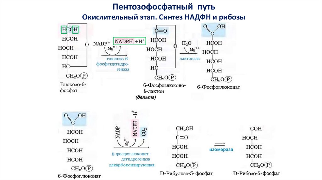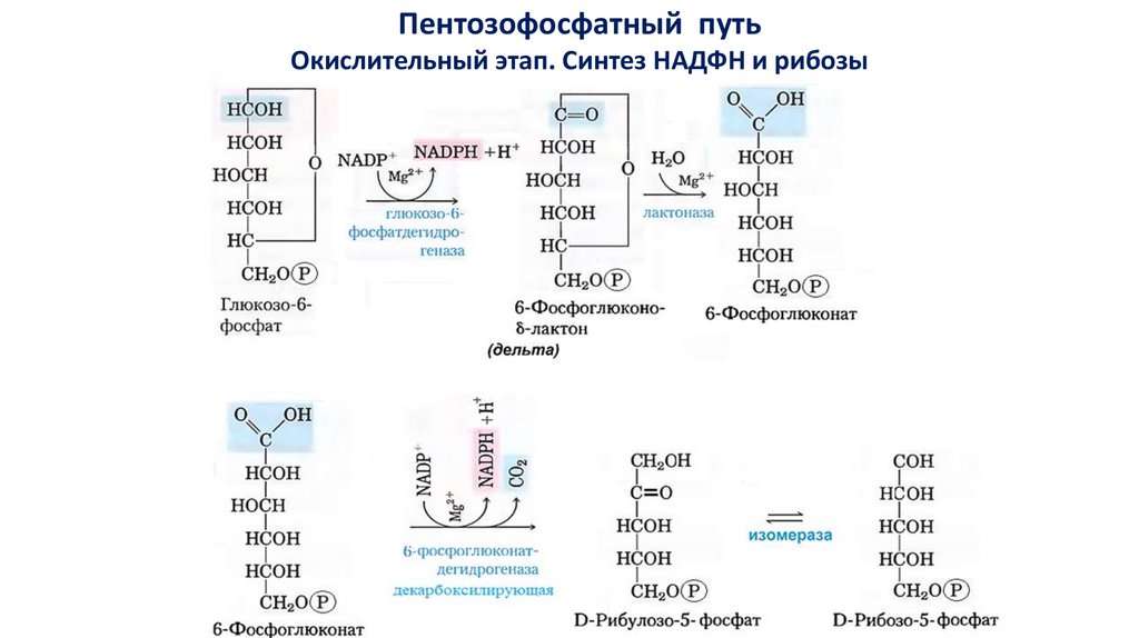 Глюкозо-6-фосфат + 2 НАДФ +Н2О → рибозо-5-фосфат + СО2 +2 НАДФН2