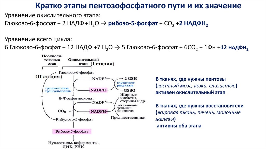Кратко этапы пентозофосфатного пути и их значениеУравнение окислительного этапа: