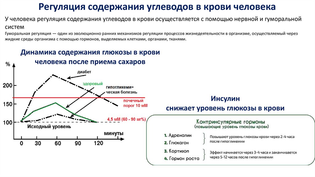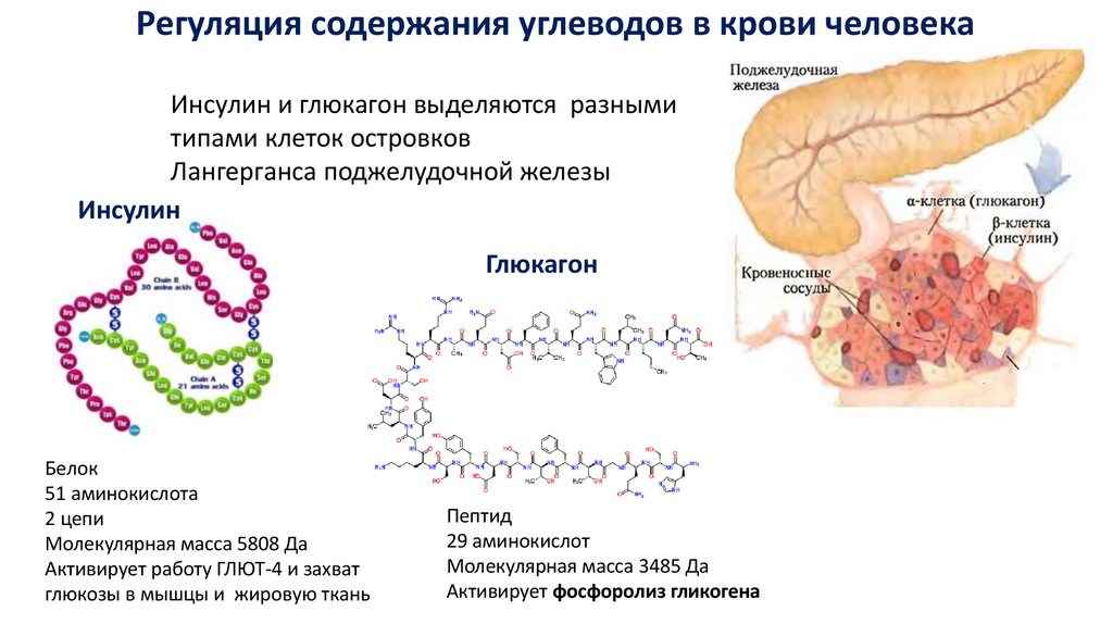 Регуляция содержания углеводов в крови человекаИнсулин и глюкагон выделяются разными