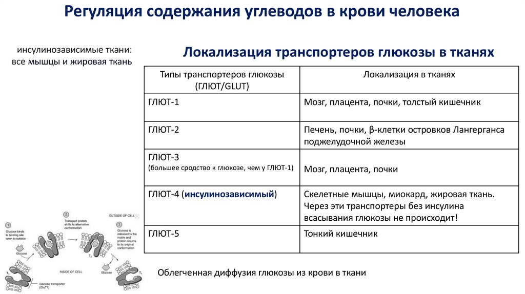 Регуляция содержания углеводов в крови человекаЛокализация транспортеров глюкозы в тканях