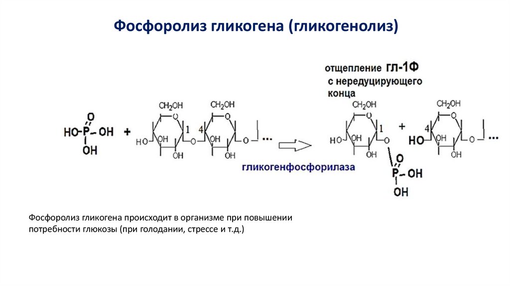 Фосфоролиз гликогена (гликогенолиз)Фосфоролиз гликогена происходит в организме при повышении