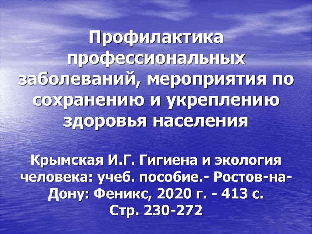 1. Профилактика профессиональных заболеваний, мероприятия по сохранению и укреплению здоровья населения Крымская И.Г. Гигиена и