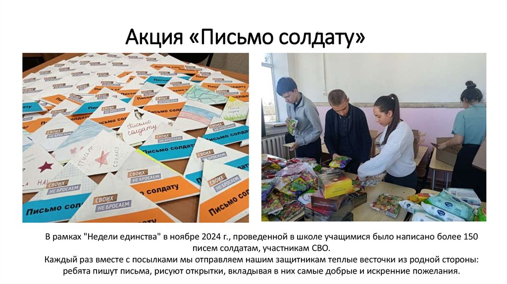Акция «Письмо солдату»В рамках "Недели единства" в ноябре 2024 г., проведенной в школе учащимися было написано более 150