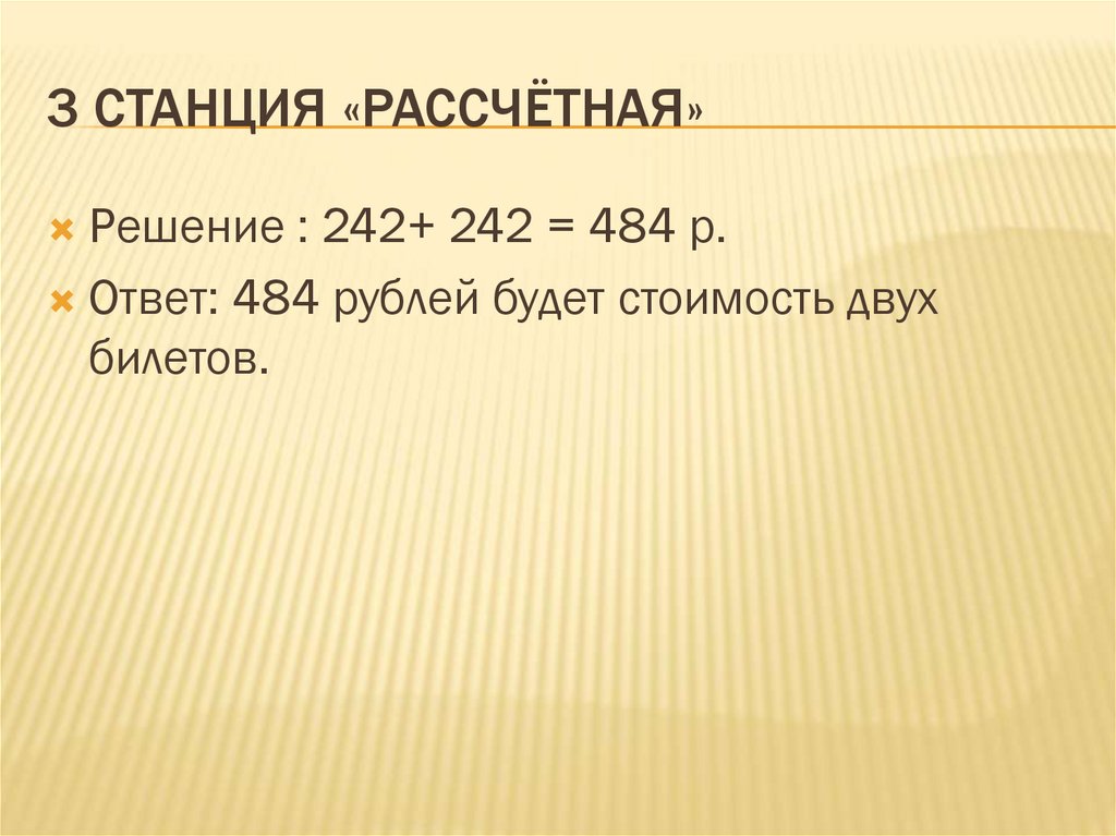 3 СТАНЦИЯ «РАССЧЁТНАЯ»Решение : 242+ 242 = 484 р.