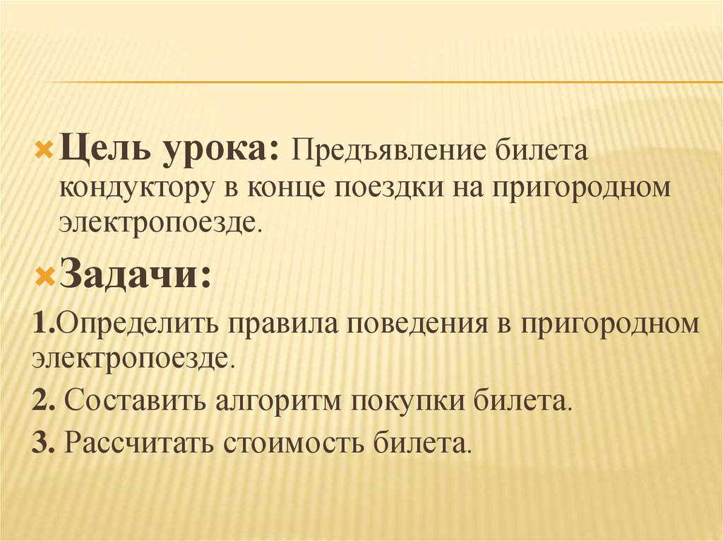 Цель урока: Предъявление билетакондуктору в конце поездки на пригородном