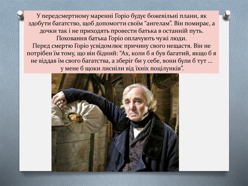 У передсмертному маренні Горіо будує божевільні плани, якздобути багатство, щоб допомогти своїм “ангелам”. Він помирає, а
