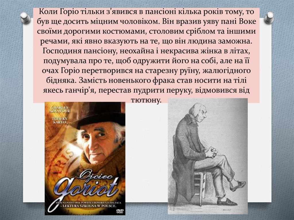 Коли Горіо тільки з’явився в пансіоні кілька років тому, тобув ще досить міцним чоловіком. Він вразив уяву пані Воке