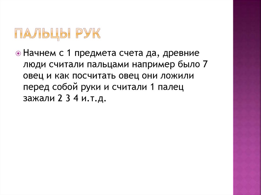 Начнем с 1 предмета счета да, древниелюди считали пальцами например было 7