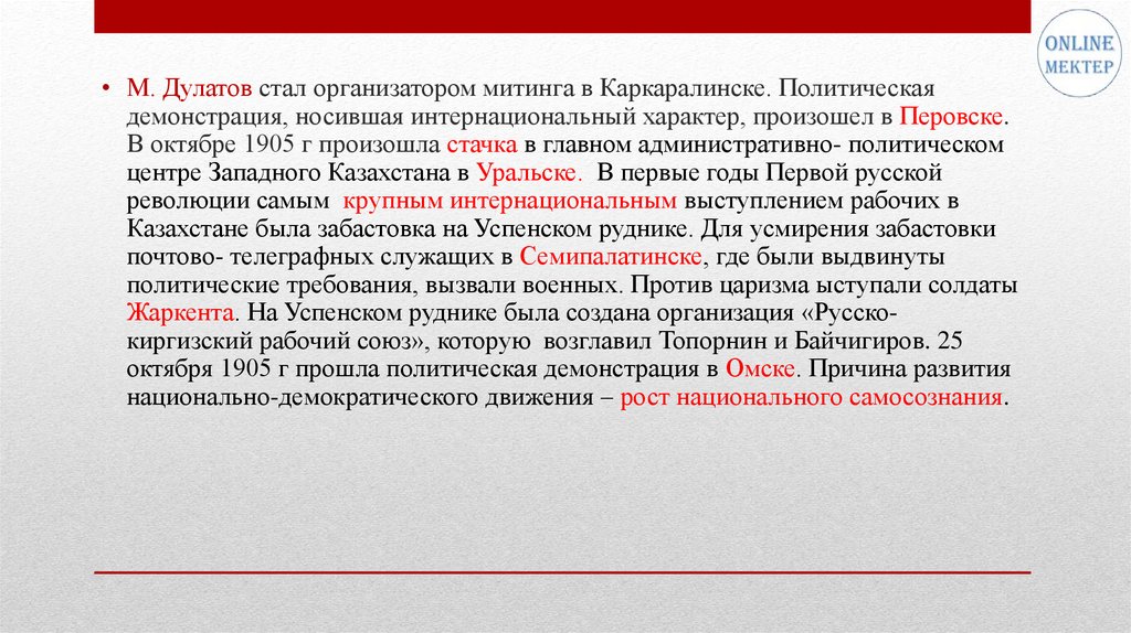 • М. Дулатов стал организатором митинга в Каркаралинске. Политическаядемонстрация, носившая интернациональный характер, произошел в Перовске.