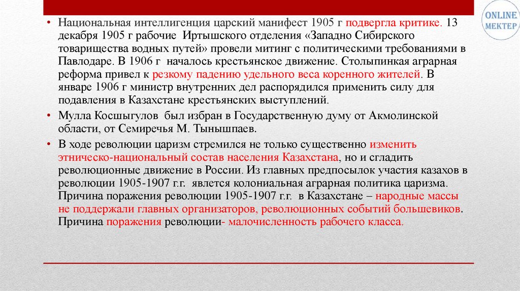 Причина поражения революции 1905-1907 г.г. в Казахстане – народные массы