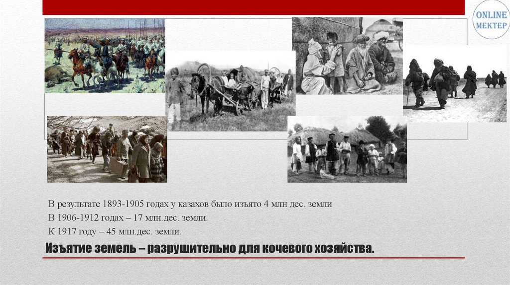 В результате 1893-1905 годах у казахов было изъято 4 млн дес. землиВ 1906-1912 годах – 17 млн.дес. земли.