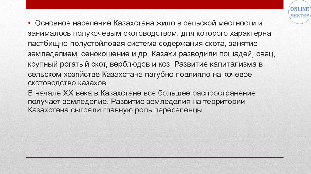 • Основное население Казахстана жило в сельской местности изанималось полукочевым скотоводством, для которого характерна