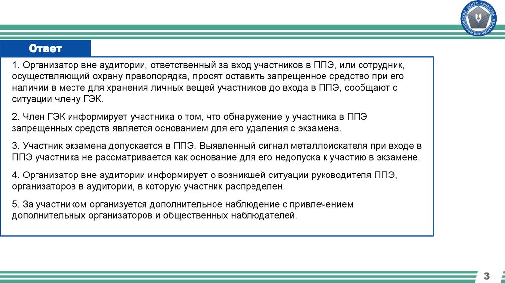 Ответ1. Организатор вне аудитории, ответственный за вход участников в ППЭ, или сотрудник,