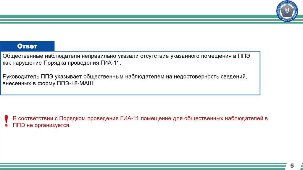 ОтветОбщественные наблюдатели неправильно указали отсутствие указанного помещения в ППЭ