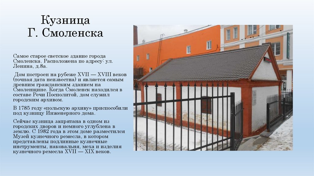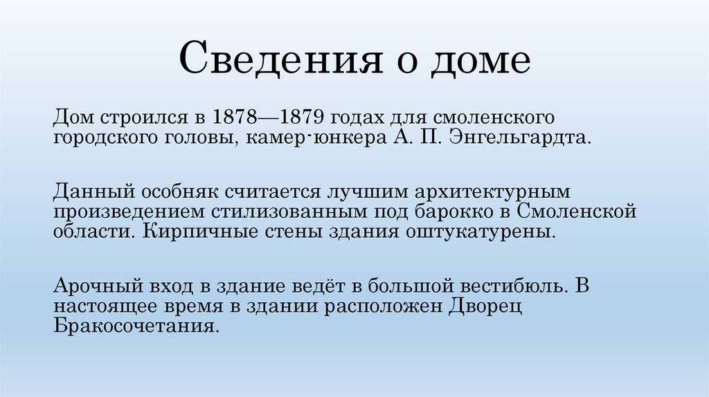 Сведения о домеДом строился в 1878—1879 годах для смоленского