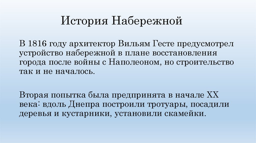 История НабережнойВ 1816 году архитектор Вильям Гесте предусмотрел
