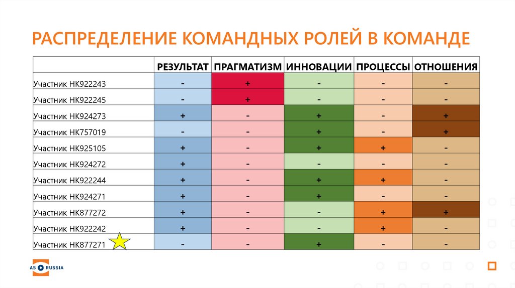 РАСПРЕДЕЛЕНИЕ КОМАНДНЫХ РОЛЕЙ В КОМАНДЕРЕЗУЛЬТАТ ПРАГМАТИЗМ ИННОВАЦИИ ПРОЦЕССЫ ОТНОШЕНИЯ
