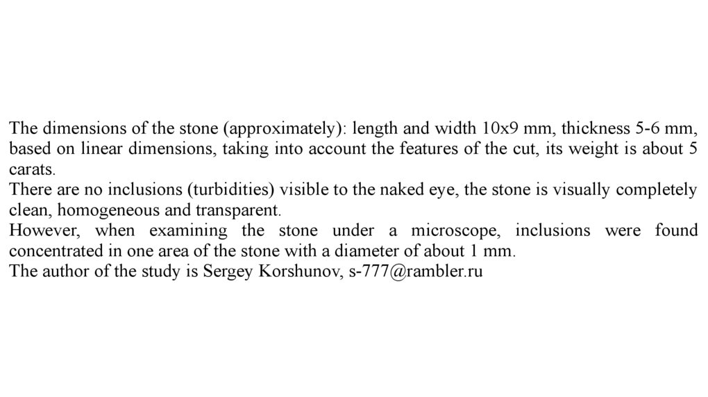 The dimensions of the stone (approximately): length and width 10x9 mm, thickness 5-6 mm, bThere are no inclusions (turbidities) visible to the naked eye, the stone is visually completely cl