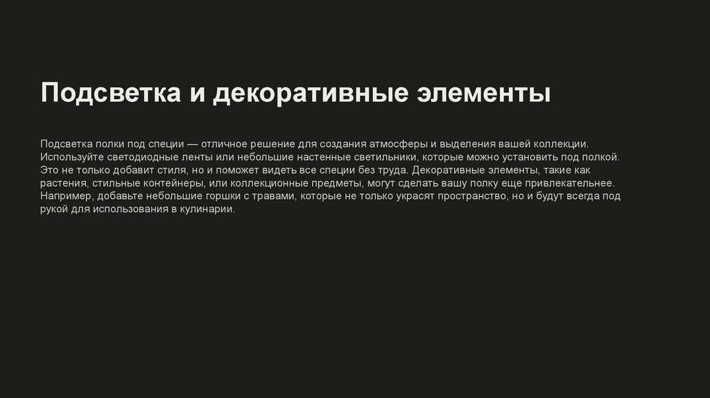 Подсветка и декоративные элементыПодсветка полки под специи — отличное решение для создания атмосферы и выделения вашей коллекции.