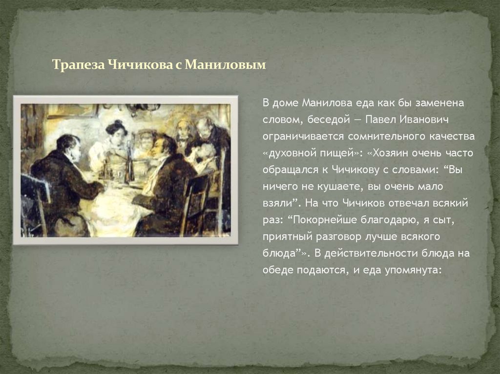 Трапеза Чичикова с МаниловымВ доме Манилова еда как бы заменена