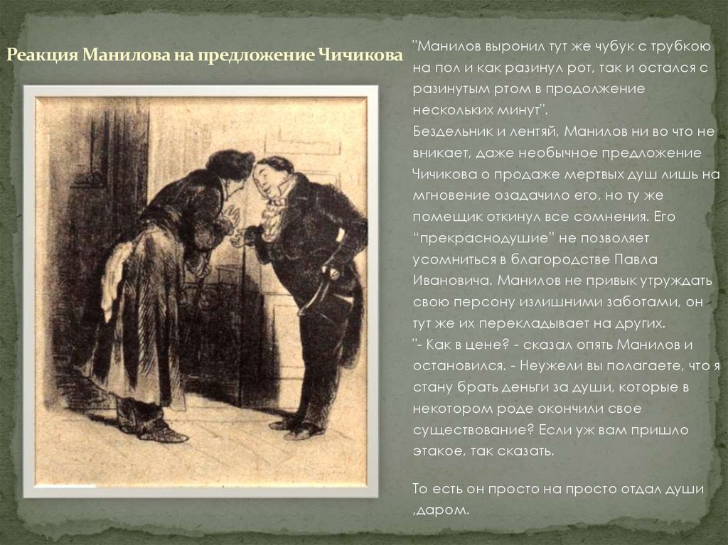 Реакция Манилова на предложение Чичикова"Манилов выронил тут же чубук с трубкою