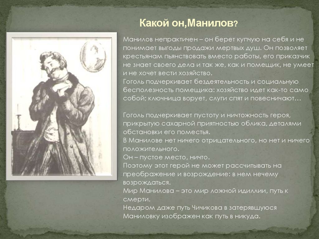 Какой он,Манилов?Манилов непрактичен – он берет купчую на себя и не