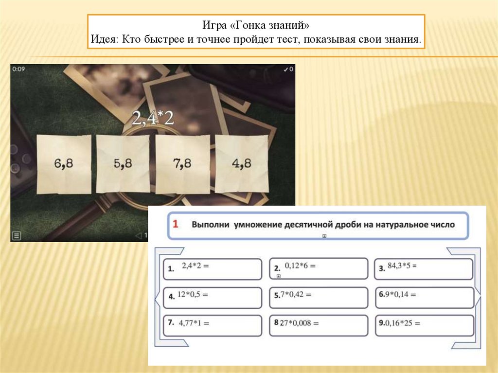 Игра «Гонка знаний»Идея: Кто быстрее и точнее пройдет тест, показывая свои знания.