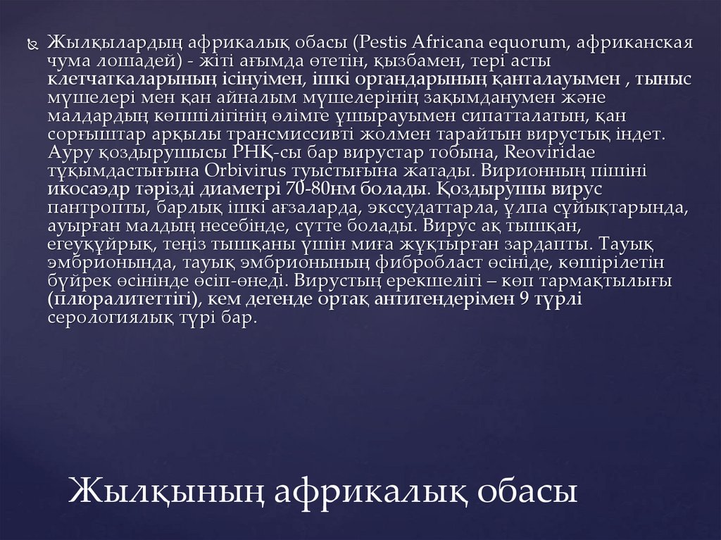 Жылқылардың африкалық обасы (Pestis Africana equorum, африканскаячума лошадей) - жіті ағымда өтетін, қызбамен, тері асты