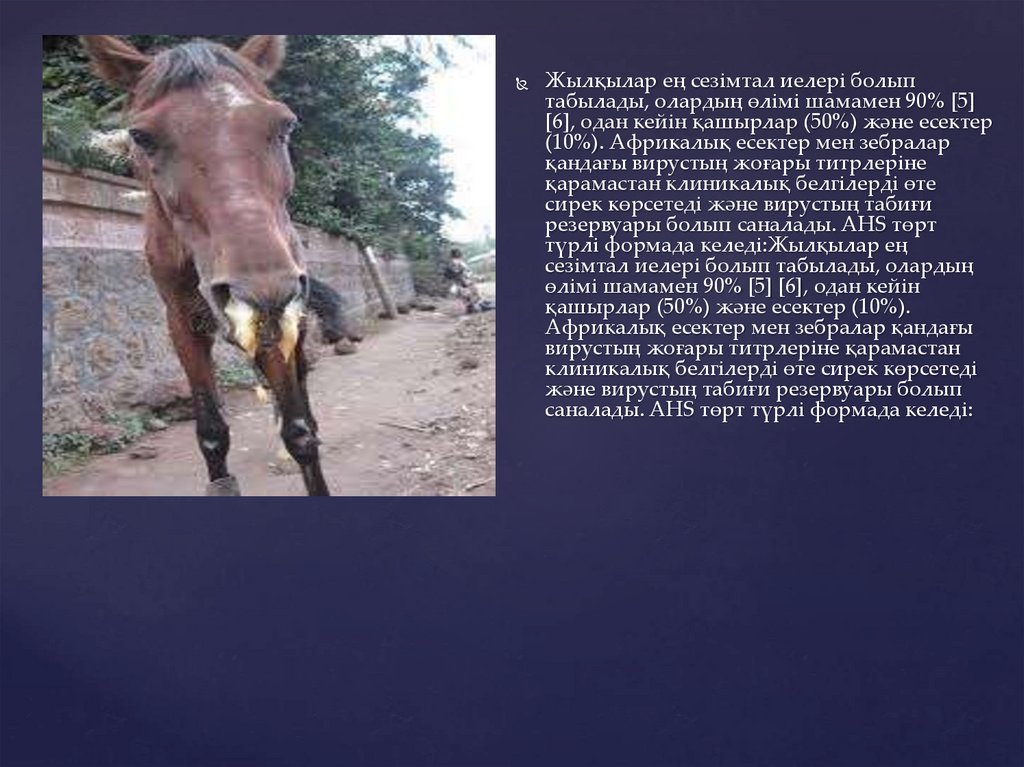Жылқылар ең сезімтал иелері болыптабылады, олардың өлімі шамамен 90% [5]